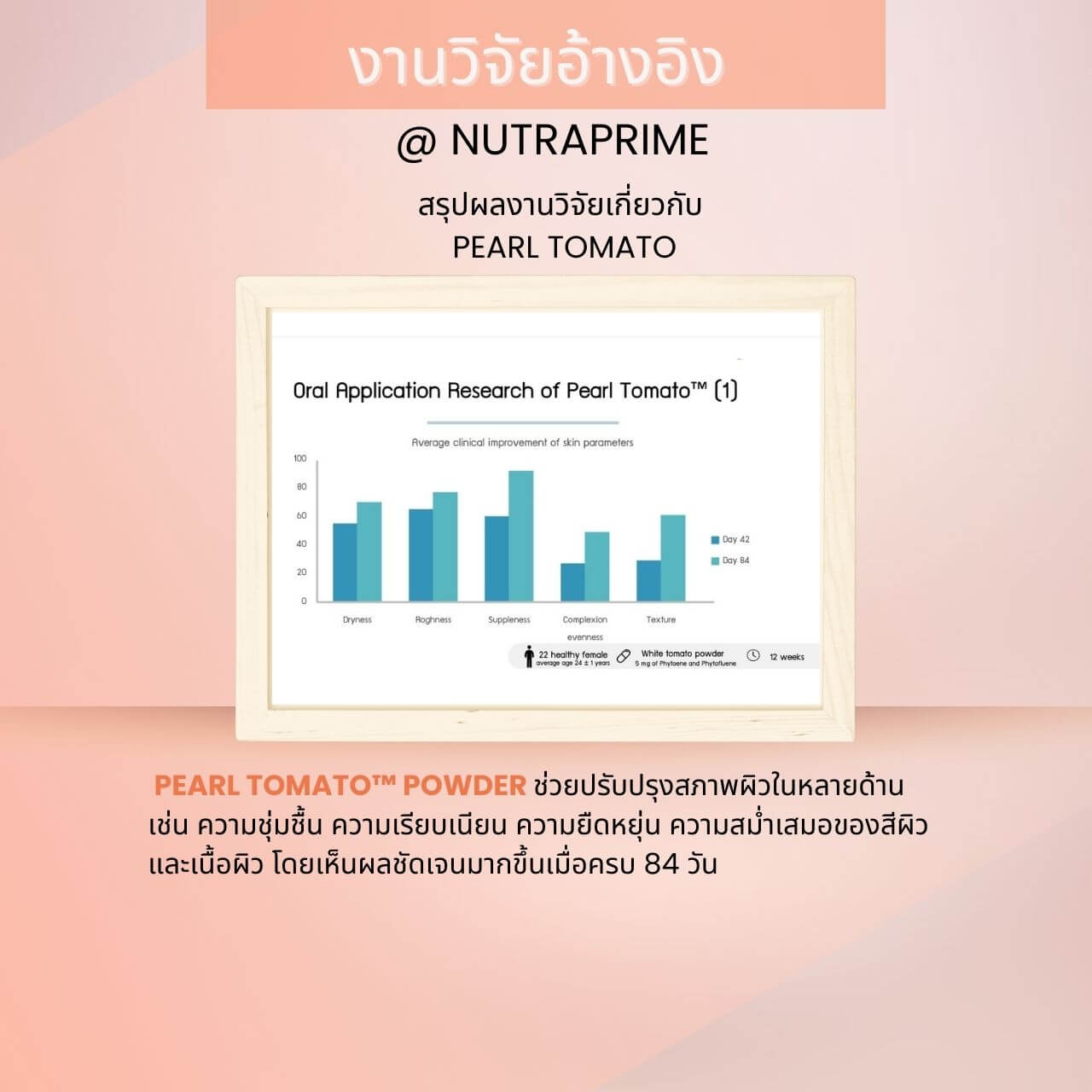 - Pearl Tomato: ปรับสีผิวให้สม่ำเสมอ ปกป้องผิวจากรังสี UV